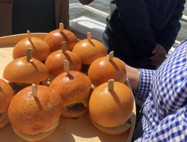 It was a fantastic afternoon well spent aboard Magic Charters for their High Tea cruise departing from the Docklands. It cruised past Williamstown and all the way up to Hobsons Bay, allowing for a brilliant view of the city skyscrapers, the massive container ships along the Yarra River, and several impressive private boats out on the water. Upon arrival, a glass of sparkling wine and an iced black tea were provided, with further rounds offered as the savoury course commenced. This initial selection included a generous spread of arancini balls, burger sliders, puff pastries, and sandwiches, all accompanied by plenty of hot black tea. A colourful tiered stand of desserts followed, featuring brownies, macarons, lemon tarts, trifle cups, and scones with Strawberry jam and Chantilly cream, which were served alongside black coffee. The tables were set quite nicely with a cute milk jug, sugar cube container, cups and saucers and standard cutlery, while the staff utilised very pretty teapots and coffee pots for the service throughout the cruise.